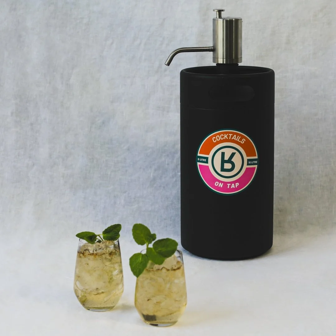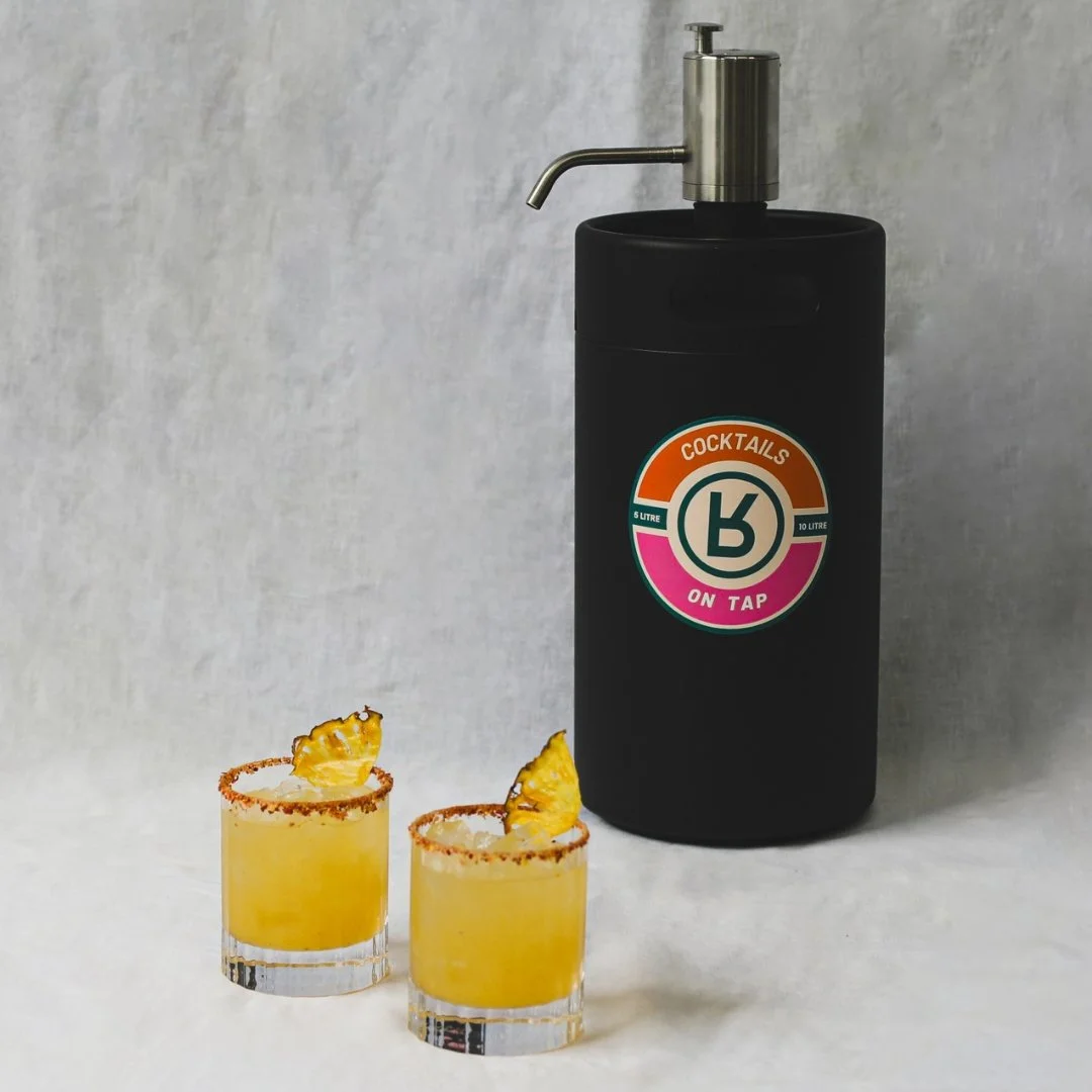 You'll get your ready to drink cocktails delivered in the keg size of your choice - 2, 5 or 10 litres. Our 2 and 5 litre kegs are double wall insulated, so they'll stay cold for up to 10 hours, while our 10 litre kegs come with a neoprene sleeve to keep them chilled. Most options are served over ice so there’s no need to make room in your fridge to continue keeping the cocktails chilled upon delivery.